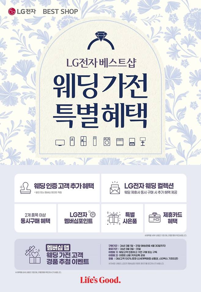 LG전자가 봄 웨딩 시즌을 맞아 베스트샵에서 가전을 구매하거나 구독하는 웨딩 고객에게 경품과 할인 쿠폰 등 다양한 혜택을 제공하는 이벤트를 마련했다.