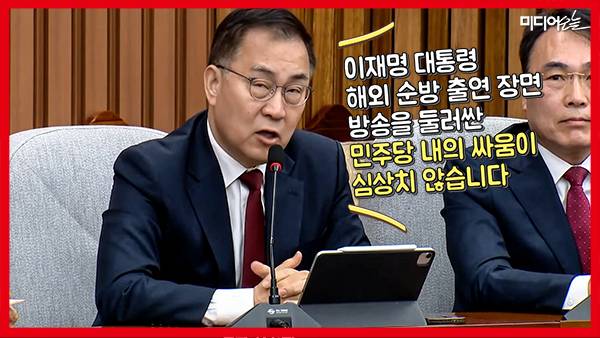최형두 간사는 6일 당 원내대책회의에서 "이재명 대통령 해외 순방 출연 장면 방송을 둘러싼 더불어민주당 내에 싸움이 심상치 않다"며 "그동안 언론계와 우리 국민의힘은 더불어민주당이 정파적, 편파적 공영방송을 영구 장악하기 위해서 방송법을 개악했다고 생각해 왔다. 이제 보니 정부, 여당 내 특정 진영이 공영방송을 좌지우지하려는 속셈이었음이 드러났다"고 말했다.