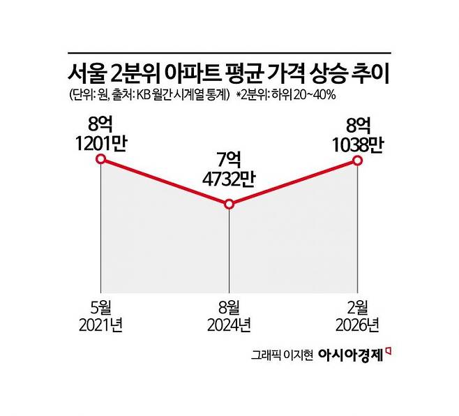 6일 KB부동산 월간 시계열 통계를 보면, 지난달 서울 아파트 하위 20~40%(2분위) 평균 매매가격은 8억1038만원으로 집계됐다. 서울 2분위 아파트 평균 가격은 2021년 5월(8억1201만원) 처음으로 8억원대를 넘어섰다가 2023년 1월 들어 다시 7억원대로 내려왔다. 이후 장기간 횡보세를 이어왔다. 그러다 지난해 6·27 대출 규제 이후 상승세를 거듭하며 3년여 만에 다시 8억원대로 집계됐다.