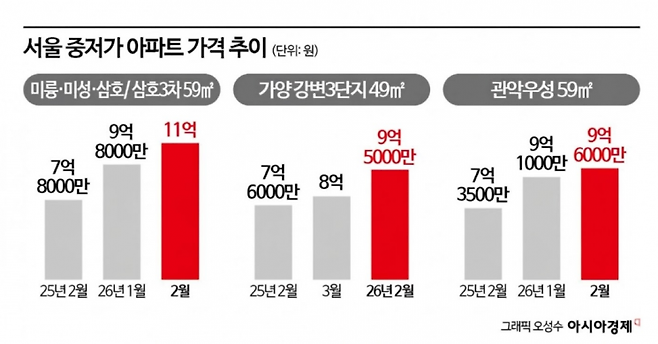 서울 외곽 지역에서는 지난해 상반기만 7억원대에 머물던 단지들이 올해 들어 9억원 넘는 가격대에 신고가를 경신하는 사례가 잇따르고 있다. 국토교통부 실거래가 공개시스템에 따르면 노원구 대표 재건축 단지인 월계시영아파트(미륭·미성·삼호3차)는 지난달 10일 전용59㎡(삼호3차) 매물이 11억원에 거래되며 신고가를 기록했다. 지난 1월 9억8000만원에 신고가를 쓴 뒤 불과 1개월 만에 1억2000만원이 뛰었다.