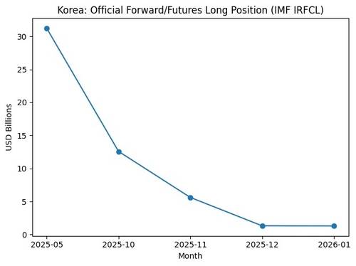 해당 수치는 IMF 외환보유액 템플릿(IRFCL)의 '선물환·선물 롱 포지션(aggregate long positions)' 항목으로, 외환당국의 선물환 개입 규모를 추정하는 대표적인 지표로 꼽힌다.