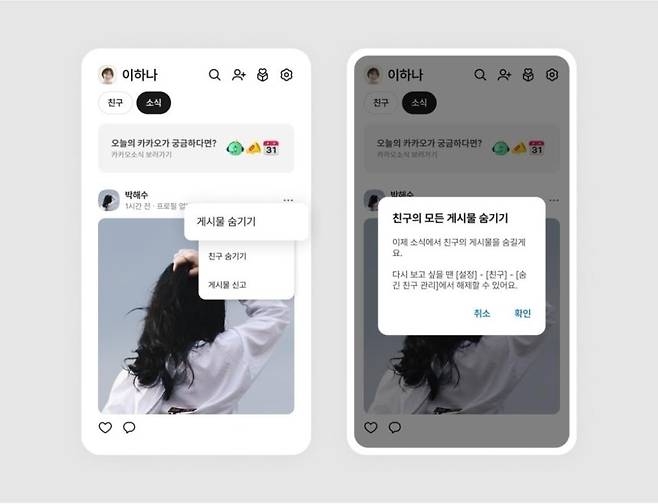 카카오는 6일 올해 두 번째 카카오톡 정기 업데이트를 통해 친구탭 소식 피드에서 특정 게시물을 숨길 수 있는 기능을 새로 도입했다고 밝혔다.