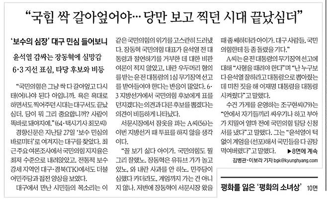다음날인 3월 2일 자 <경향신문> 대구 르포 기사의 제목은 "'대구서도 끝났심더' '꼴 보기 싫다 아이가'...국힘에 싸늘해진 보수 민심 바로미터"입니다. 성한용 기자의 칼럼은 민주당이 대구·경북에서는 못 이긴다고 봅니다. 반면 경향은 대구도 국민의힘에 등 돌리고 있다고 합니다.