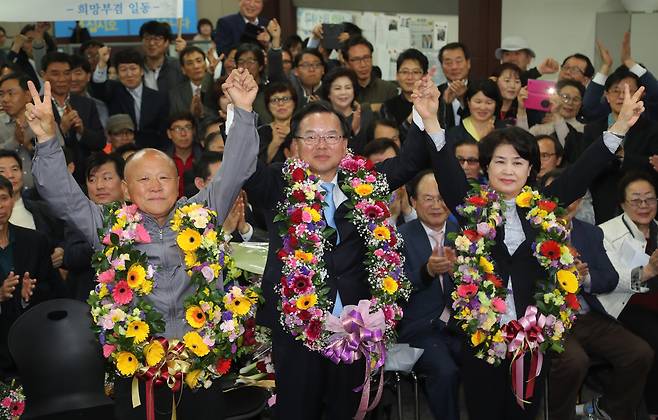 | ▲ 제20대 국회의원 선거 대구 수성구갑에서 당선한 당시 김부겸 더불어민주당 후보가 2016년 6월 13일 오후 대구 수성구 자신의 선거사무실에서 당선이 유력해지자 아버지 김영용, 부인 이유미와 함께 지지자로부터 축하꽃다발을 건네받고 취재진을 향해 포즈를 취하고 있다. |