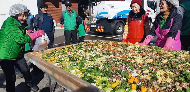 | ▲ 최미희 씨가 지역 봉사자들과 함께 김장 봉사활동에 참여해 양념을 넣고 있다. |