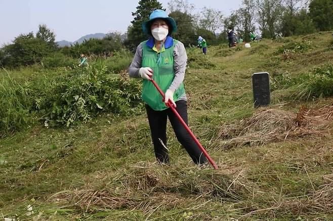 | ▲ 새마을부녀회장으로 활동하던 최미희 씨가 추석 명절을 앞두고 수석동 무연고 묘지를 정비하며 갈퀴로 풀을 모아 치우고 있다. |
