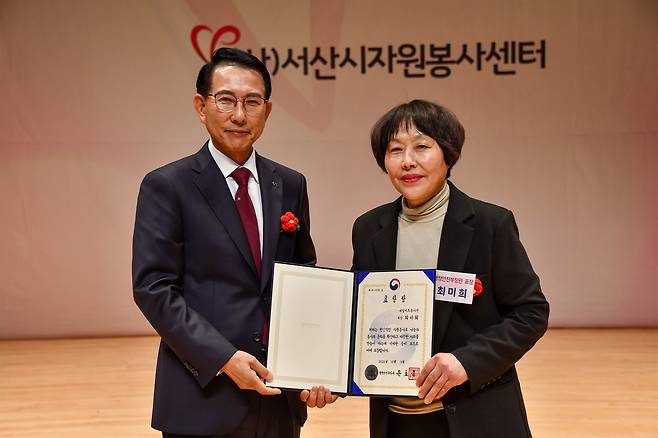 | ▲ 30년 가까이 지역 봉사를 이어온 공로로 행정안전부 장관표창을 받은 최미희 씨(오른쪽)가 이완섭 서산시장과 기념촬영을 하고 있다. |