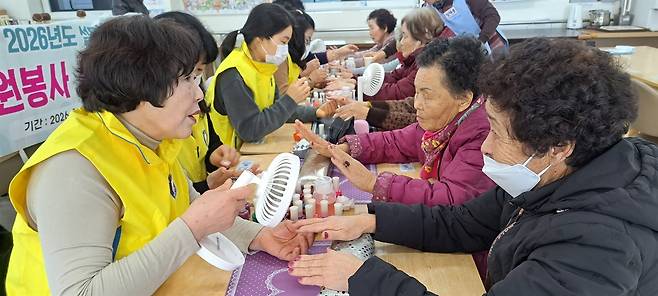 | ▲ 최미희 씨(왼쪽 첫번째)가 어르신들을 위한 네일아트 봉사활동을 하고 있다. |