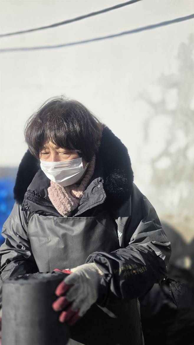 | ▲ 연탄 봉사활동 현장에서 작업을 하고 있는 최미희 씨. 그녀는 밥차 봉사와 주거환경 정비 등 30년 가까이 지역 봉사를 이어오고 있다. |
