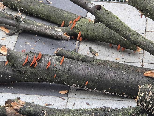그날 아침, 쓰러진 나무가 치워지기 전 나는 주방 창가로 한 번 더 다가갔다. 밤에는 보이지 않던 것들이 아침 햇빛 속에서 또렷하게 드러났다. 뿌리째 뽑힌 벚나무가 길 위에 누워 있었다. 부러진 잔가지들과 길게 뻗은 나무 둥치를 바라보고 있는데, 문득 눈에 들어온 것이 있었다.