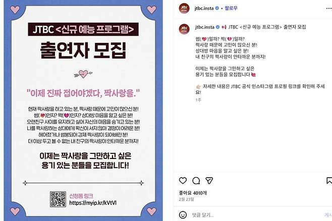 '짝사랑 고민 해결'을 주제로 한 이 예능 프로그램은 얼마 전 출연진을 공개 모집했다.