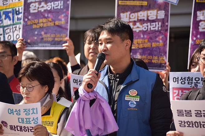 부산지하철노조 김준우 수석부위원장은 "올해 육아휴직을 3개월 이상 사용할 계획이 있는지 조합원 전수 조사를 실시했는데 180명이 사용할 계획이 있다고 조사 결과가 나왔다. 이 180명이 육아휴직을 사용하려면 대체 인력이 들어와야 한다. 기재부에서는 3개월 이상 육아휴직자에 대해서 대체 충원이 가능하도록 지침을 내렸다. 하지만 지방 공기업을 관장하는 행정안전부는 기재부 지침을 전부 삭제했다. 예산도 전혀 배정해 주고 있지 않다. 정부 정책이 일과 가정을 양립하는 것인데 행정안전부는 정부 정책에 대해서도 역행을 하고 있다. 같이 투쟁해서 여성해방이 곧 노동 해방이라는 말을 현실로 만들어 갈 수 있었으면 좋겠다"라고 말했다.