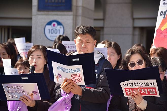 기자회견 시작에 앞서 참가자들은 여성인권을 상징하는 보라색 스카프를 함께 팔에 감고 "성평등 민주주의 실현하자, 여성 혐오범죄 강력하게 처벌하라" 등의 구호를 외쳤다.