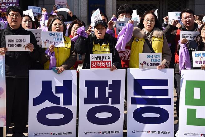 부산여성사회교육원 김혜숙 대표는 "여성의 정치 대표성을 확대하고 공천 할당제 준수하라. 지방의회 의원 선거에서 여성 공천 비율 30% 이상을 의무화하고, 현재 10% 비례대표 의석을 30% 확대를 통해 여성의 목소리가 정책에 직접 반영되도록 하는 제도를 개선하라. 선거구제를 여성이나 소수 정당 후보의 진입 장벽을 낮출 수 있는 중대 선거구제로 개편할 것을 강력히 요구한다. 이번 6.3 지방선거에서 부산시와 후보자들이 실효성 있는 성평등 추진 체계 강화 정책을 수립하여 여성이 보다 자유롭고 평등하게 살아갈 수 있는 성평등한 부산으로 도약하기를 다시 한 번 강력히 요구한다"고 말했다.