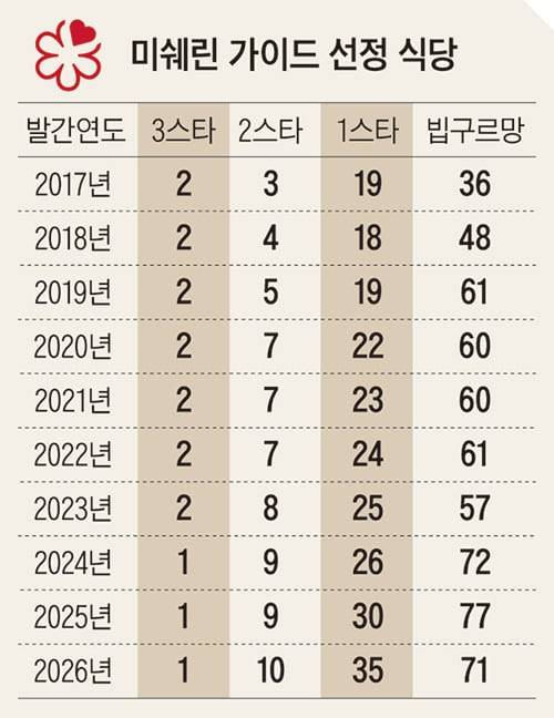 운영 주체의 변화도 눈에 띈다. 초반에는 가온(광주요)·라연(신라호텔) 등 자본력이 튼튼한 대기업이나 중견기업이 운영하는 한식당이 상위권을 점령했으나, 이후 모수(안성재)·밍글스(강민구)·권숙수(권우중) 등 셰프가 곧 브랜드인 ‘오너 셰프 레스토랑’이 리스트의 80% 이상을 차지하고 있다. 외식 컨설턴트 A씨는 “지난 10년간 미쉐린 가이드는 정부의 정책 홍보 수단에서 셰프들이 자신의 이름을 걸고 치열하게 부딪히는 진짜 전쟁터가 됐다”고 했다.