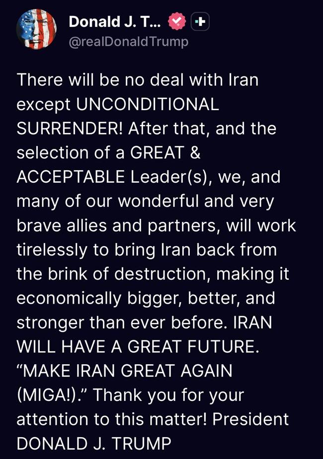 이어 "항복 이후 위대하고 받아들일 수 있는 지도자가 선택되면 미국과 동맹국들은 이란을 파괴의 벼랑에서 되돌리기 위해 tirelessly(쉼 없이) 노력할 것"이라며 "이란을 경제적으로 더 크고, 더 강하고, 더 번영하는 나라로 만들겠다"고 주장했다.
