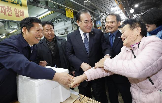 | 민주, 영광서 현장최고위 더불어민주당 정청래 대표(왼쪽)가 6일 전남 영광군에서 열린 현장 최고위원회의를 마치고 영광터미널 시장을 찾아 상인들과 인사를 하고 있다. 민주당은 6·3 지방선거 당내 경선이 확정된 서울 경기 전남광주 등 3개 지역부터 약 한 달에 걸친 경선 일정을 시작할 계획이다. 영광=뉴스1 |