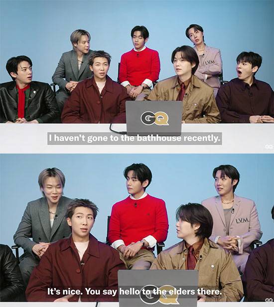 지민과 목욕탕을 가본 경험이 있는 슈가는 "처음에 지민이와 목욕탕 갔을 때 엄청 부끄러워하더니 그 다음부터는 괜찮더라"라고 이야기했다. 지민은 "어르신들과 인사 좀 하고 하니까 괜찮더라"고 답해 눈길을 끌었다.