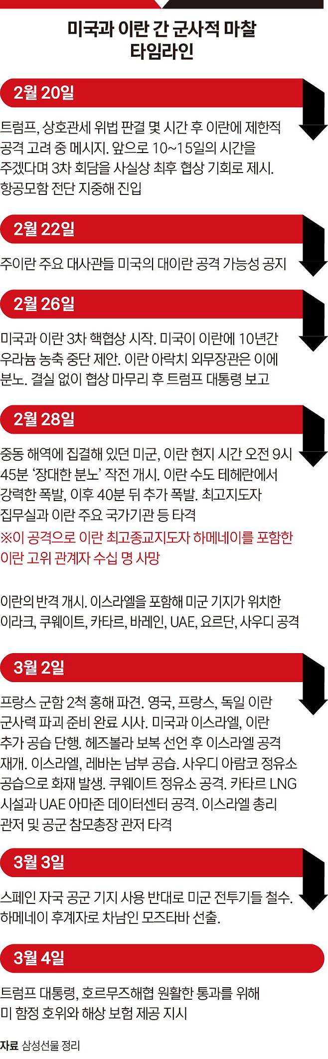 앞서 미국은 지난 2월 6일 8개월 만에 핵 협상을 재개하고 2월 26일까지 세 차례에 걸쳐 핵 협상을 이어왔다. 2월 20일엔 3차 회담을 사실상 최후 협상 기회로 제시하며 트럼프 대통령이 직접 이란의 핵 프로그램을 압박하기 위한 ‘제한적 군사 공격을 고려 중’이라고 말했다.