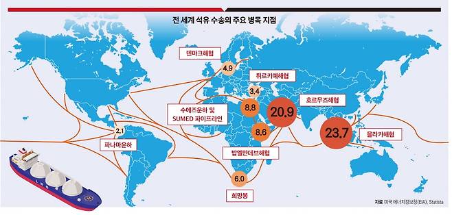 미국-이스라엘에 맞서 이란이 꺼내 든 최후의 카드는 ‘호르무즈해협 봉쇄’다. 폭이 33km에 불과한 이 좁은 수로는 전 세계 해상 석유 무역의 27%가 통과하는 병목 지점이다.