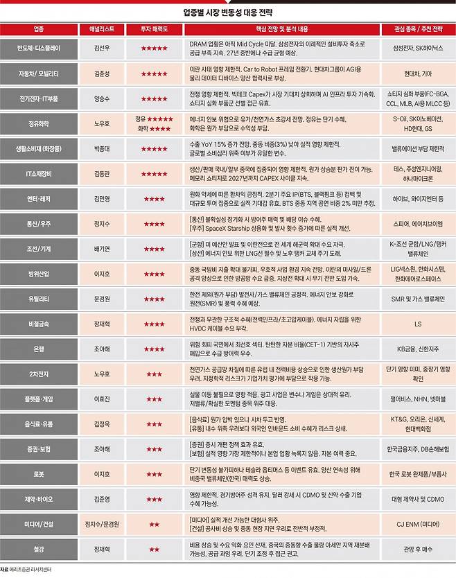 메리츠증권 리서치센터의 업종별 분석에 따르면 반도체 업종은 단기적인 매크로 불확실성에도 불구하고 AI 산업의 폭발적인 성장세라는 강력한 펀더멘털을 보유하고 있다. 김선우 애널리스트는 “D램 업황은 중간점(Mid Cycle)에도 미치치 못한 상태”라며 “현재 발생하고 있는 DRAM 공급부족 현상은 쉽게 해결되기 어려우며 빨라도 2027년 중반에나 수급 균형이 맞춰질 수 있다”고 강조했다. 추천주는 삼성전자, SK하이닉스다.