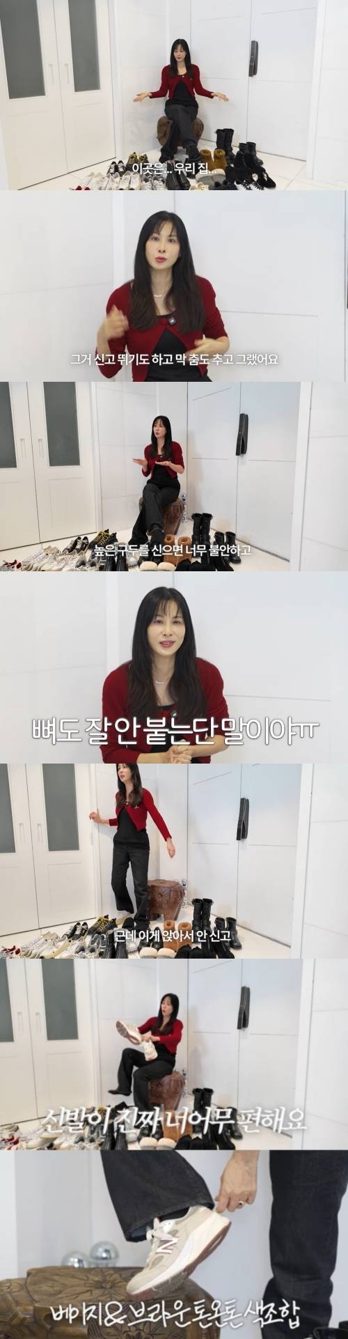 하이힐 없이 운동화 지분이 80%를 자랑했고, "어렸을 때는 높은 구두와 예쁜 슈즈를 많이 신었다. 그걸 신고 나름대로 뛰기도 하고 춤도 췄는데 한번 내려오니까 다시 못 올라가겠다"며 "높은 구두를 신으면 너무 불안하고 걸음 걸이가 이상해진다. 우리 나이에 넘어지면 뼈도 잘 안 붙는다.(웃음) 이제 겁이 점점 많아져서 운동화를 많이 신는다"고 말했다.