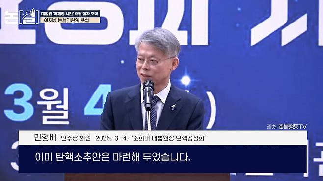 “대법원장을 탄핵하는 수밖에 없습니다. 이미 탄핵소추안은 마련해 두었습니다. 지금 최혁진 의원을 비롯해서 몇몇 분이 발의를 해야 한다, 그 전에 의견을 들어보자 해서 오늘 자리가 마련됐습니다.” (민형배 민주당 의원, 3월 4일 조희대 대법원장 탄핵공청회)