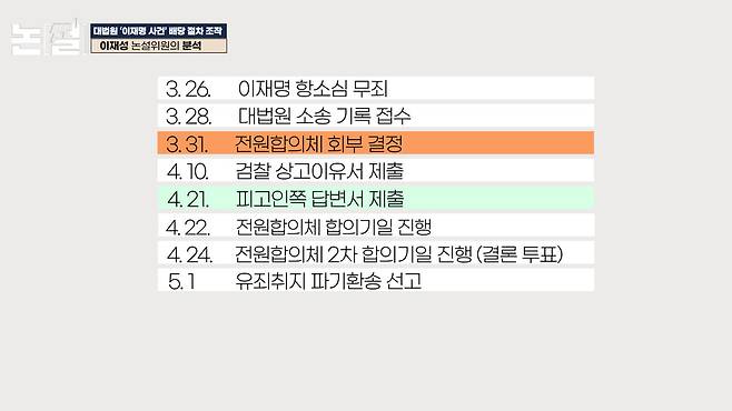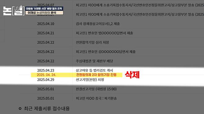 2025년 5월 3일 당시에는 없던 4월 23일 일정이 새로 생겼습니다. “상고이유 등 법리검토 개시”를 이날 했다는 겁니다. 이날은 원래 대법관들끼리 점심 식사를 함께 했다고 알려진 날이죠. 그리고 원래는 다음날인 24일 두번째 심리기일을 진행했다고 발표했었는데, 사이트에는 이 사실이 삭제된 상태입니다. 전원합의기일은 원래 한달에 한번 열도록 돼 있죠. 이례적인 이틀만의 전원합의기일을 숨기려고 삭제한 걸까요? 아니면 사실상 첫번째이자 마지막 심리기일이라는 평가를 받았던 24일 회의를 숨기고 23일 ‘법리검토 개시’라는 일정을 추가함으로써 29일 선고기일 지정 이전까지 숙고를 계속한 것처럼 보이고 싶었던 걸까요? 현재로선 진실을 알 수 없습니다. 다만 한가지 분명한 건, 대법원이 기록을 계속해서 수정하고 있다는 겁니다. 최소한 지난해 발표와 현재 기록 둘 중의 하나는 거짓입니다. 여러분 상상이 가십니까? 대법원이 중대 사건의 배당 절차를 사후 조작하다 걸린 겁니다. 거짓을 거짓으로 덮으려다 보니 거짓말이 태산처럼 쌓여갑니다.