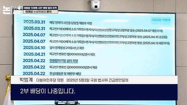 “4월 22일 전원합의기일 심리지정이 먼저 있었습니다. 같은 날이긴 하나 뒤에 주심 대법관 및 재판부 배당 이렇게 돼 있습니다. 이거 어떻게 설명하실래요? 전원합치 심리기일 지정이 먼저예요. 그리고 박영재 대법관이 주심대 법관이라고 하는 2부 배당이 나중입니다. 모르시죠? 이렇게 날림으로 한 재판입니다. 기초부터 허물어진 겁니다. 사람 바보로 알지 마세요. 국민들이 다 알고 있습니다. 날림 판결입니다.” (박범계 민주당 의원, 2025년 5월 3일 국회 법사위 긴급현안질의)