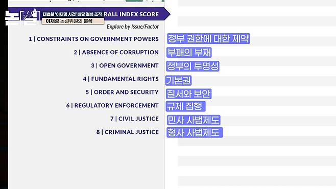 “월드저스티스프로젝트에서 한 세계 140여 개국 법치주의 지수 조사 결과를 보더라도 우리나라가 세계 19위입니다.” (조희대 대법원장, 3월 3일 출근길 발언)