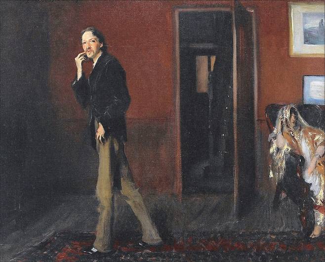 유럽에서 활동한 미국 화가 존 싱어 사전트(1856~1925)의 <스티븐슨과 패니>는 소설가의 초상화이면서 동시에 이 소설의 문제의식도 상징적으로 녹아 들어가 있다. 우리에게 익숙한 초상화 형식과는 상당히 다르다. 얼굴보다는 그를 둘러싼 상황이 먼저 다가오기 때문이다. 왼쪽의 스티븐슨이 거실을 서성이다 흘낏 시선을 돌려 감상자 쪽을 향한다. 한 손을 얼굴에 대고 있는 모습으로 볼 때 무언가 골똘히 생각에 잠겨 있었음을 느끼게 한다.