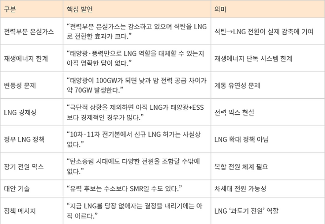 그는 재생에너지 확대 필요성에는 공감하면서도 현재 전력 시스템에서 LNG가 수행하는 역할을 단기간에 대체하기는 쉽지 않다고 지적했다.