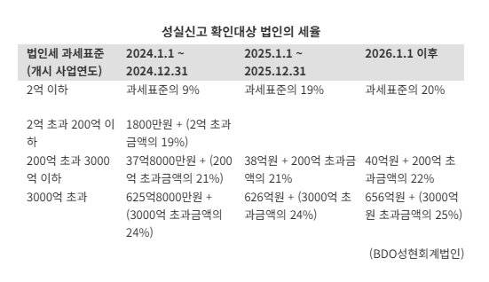 성실신고 확인 대상 소규모법인은 과세표준 2억원 이하에 대해 2024년까지는 9%의 법인세율이 적용됐다. 하지만 지난해는 1월1일 이후 개시하는 사업연도에 대해 19%가 적용되고, 올해 1월1일 이후 개시 사업연도는 20%가 적용된다. 200억원까지는 동일 세율을 적용한다.