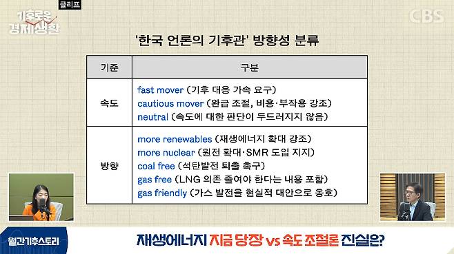 ◆ 홍종호> 기후위기 심층 취재 미디어 클리프 윤지로 대표와 함께하고 있습니다. 앞선 시간에 언론의 성향, 소위 진보냐 보수냐에 따라서 원전·재생에너지에 대한 논조와 보도량, 강조점이 달라진다는 이야기를 해봤는데요. 좀 더 깊게 이야기를 해보도록 하겠어요. 직접 분석하신 내용이 있다고요?