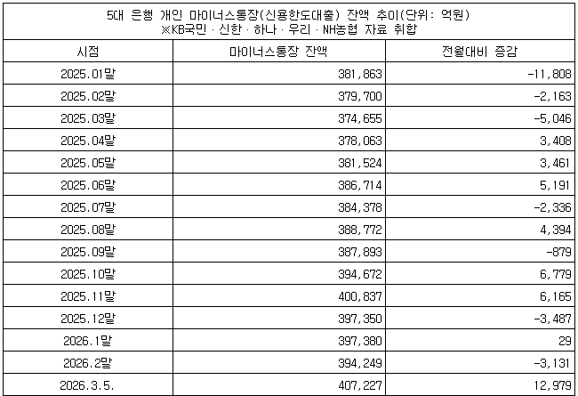 8일 금융권에 따르면 5대 은행(KB·신한·하나·우리 NH농협)의 5일 기준 개인 마통 잔액은 40조7천227억원으로 집계됐다.