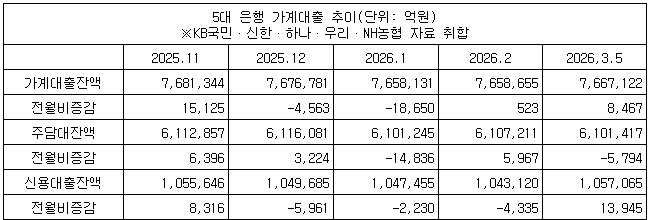 5대 은행의 5일 기준 주택담보대출 잔액은 610조1천417억원으로, 2월 말(610조7천211억원)보다 5천794억원 줄었다.