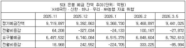 5대 은행의 정기예금은 5일 현재 944조1천25억원으로, 지난달 말보다 2조7천872억원 급감했다. 투자처를 찾지 못한 대기 자금인 요구불예금에서도 같은 기간 8조5천993억원 (684조8천604억원→676조2천610억원)이 빠져나갔다.