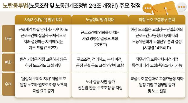 개정 노조법 2조는 노조의 교섭 파트너인 사용자(사업주)에 대해 ‘근로계약 체결 당사자가 아니더라도 근로조건에 실질적이고 구체적으로 지배·결정할 수 있는 지위에 있는 자’라는 내용을 추가했다.