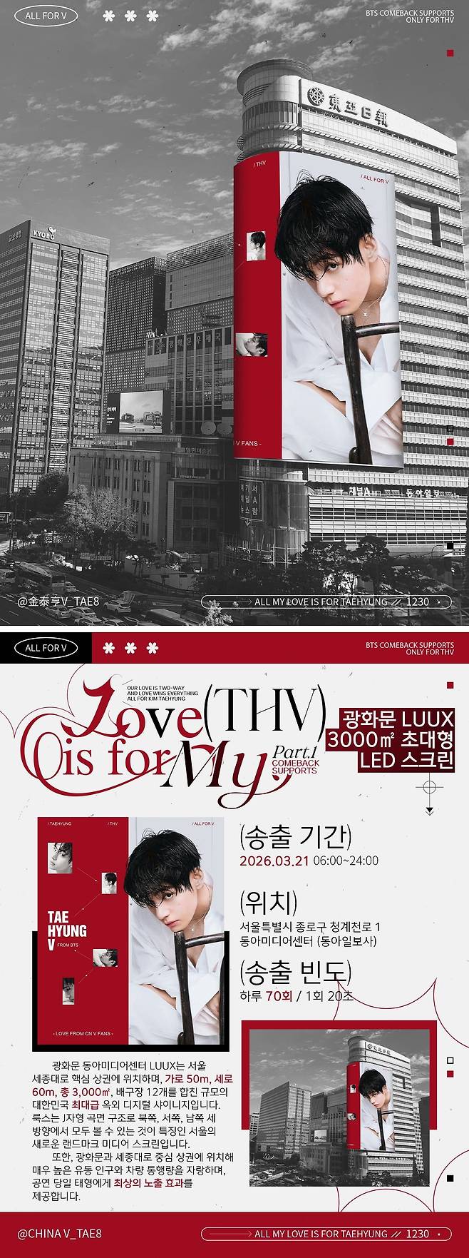 첫 번째 서포트는 서울 광화문에서 시작된다. 바이두뷔바는 광화문에 위치한 동아미디어센터 외벽 초대형 디지털 옥외 광고판 ‘룩스(LUUX)’에 뷔의 컴백 축하 영상을 송출한다고 밝혔다.