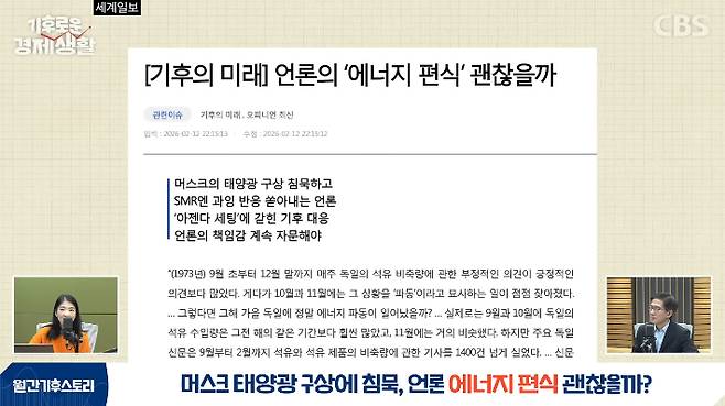 ◇ 윤지로> 네. 말씀드린 것처럼 우리 언론이 진보냐 보수냐에 따라서 에너지원을 편식하는 걸 말하는데요. 논조를 달리하는 것 말고도 정성적으로 논조가 다른 것 말고도, 보도량 자체도 굉장히 다릅니다. 제가 그 문제를 최근에 느낀 게 있어서 한 일간지에 칼럼을 썼었거든요. 계기가 됐던 건 어떤 분이 말씀을 해 주셨어요. 기후로운 경제생활에도 나오셨던 분으로 알고 있는데, 그분이 저한테 그러는 거예요. 1월 말쯤이었는데, 빅테크가 SMR에 100MW(메가와트)만 계약을 해도 국내에서 뉴스가 쏟아지는데, 머스크가 매년 태양광 100GW(기가와트)씩 만들겠다고 얘기한 건 뉴스가 없다고요.