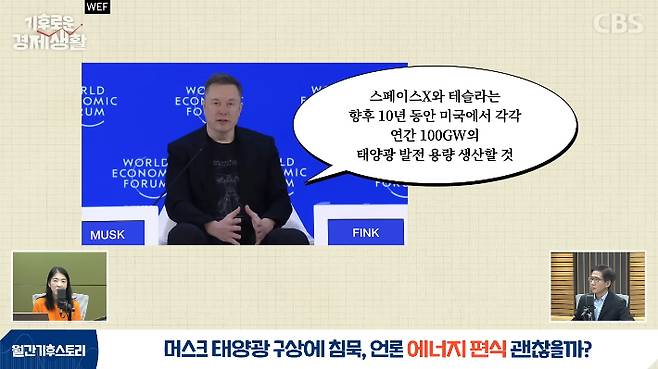 ◇ 윤지로> 네. 지금 테슬라 에너지에서 태양광을 하고 있는데, 솔라시티라는 회사를 인수한 건데 그 솔라시티가 20년 전에 만들어졌고, 만들어질 때도 머스크가 굉장히 깊숙이 개입을 했다, 그 아이디어를 줬다 이렇게 알려져 있거든요. 그만큼 머스크가 태양광에 관심이 있다는 건 잘 알겠는데, 100GW씩 만들겠다는 게, 100GW가 보통 규모가 아닌 거잖아요. 무슨 얘기인가 싶어서 뒤늦게 기사를 찾아봤는데, 1월 20일 며칠 그쯤에 다보스포럼에서 나온 발언이더라고요. 뭐라 그랬냐면, 스페이스X와 테슬라는 각각 미국 내에서 연간 100GW 규모의 태양광 제조 역량을 구축할 것이다, 대략 3년 정도 걸릴 거다라고 이야기했어요.