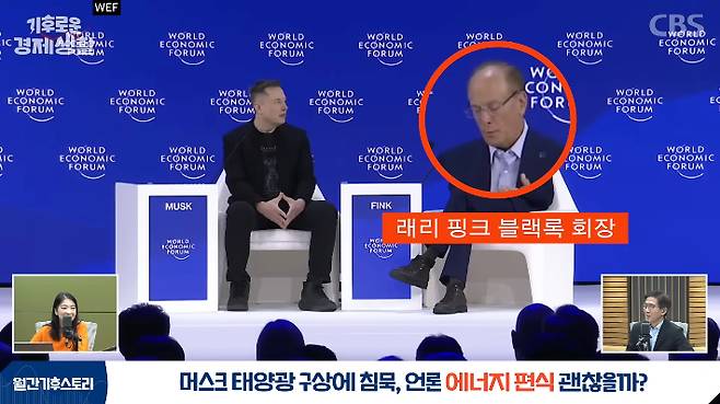 ◇ 윤지로> 맞습니다. 이 머스크 발언도 유튜브에서 다 볼 수 있었던 건데, 아무도 보지 않았던 거고요. 그냥 지나가다 머스크가 한마디 쓱 한 게 아니라, 그 자리가 어떤 자리였냐면 머스크 옆에서 대담을 한 사람이 래리 핑크였거든요.