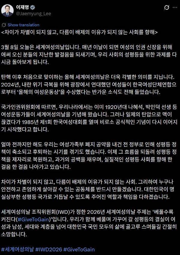 이 대통령은 이날 자신의 엑스(X·옛 트위터)에 올린 '차이가 차별이 되지 않고, 다름이 배제의 이유가 되지 않는 사회를 향해'라는 글에서 "얼마 전까지만 해도 우리는 여성가족부 폐지 공약을 내건 전 정부로 인해 성평등 정책이 축소되고 후퇴하는 시기를 겪기도 했다"며 "이제 그 흐름을 되돌려 성평등 정책을 제자리로 복원하고, 과거의 공백을 채우며, 실질적인 성평등 사회를 향해 한 걸음 한 걸음 나아가고 있다"고 말했다. 세계여성의날은 매년 3월 8일 기념되며, 올해 국제 캠페인 주제는 '베풀수록 커진다(#GiveToGain)'로 제시됐다.