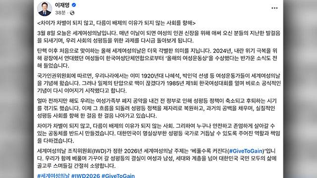 이 대통령은 오늘 SNS에 "탄핵 이후 처음으로 맞이하는 올해 세계 여성의 날은 더욱 각별한 의미"라며 "2024년 내란 위기 극복을 위해 광장에서 연대했던 여성들이 한국여성단체연합으로부터 '올해의 여성운동상'을 수상했다는 반가운 소식도 전해 들었다"고 적었습니다.