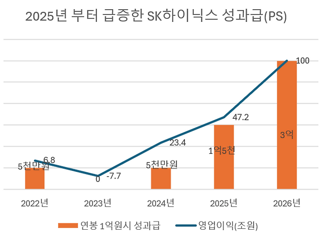 2025년 기준 SK하이닉스는 연간 매출 97조1467억원, 영업이익 47조2063억원을 기록해 10%인 4조7200억원이 성과급 대상이 됐는데요. 이에따라 기본급 기준 연봉 1억원의 경우 성과급을 포함한 1년간 총 보상이 2억6320만원에 달하게 됩니다. 상한이 있을 때는 5000만원 정도였던 성과급이 5배로 늘어난 겁니다. 더 어마어마한 것은 올해 영업이익이 지난해보다 훨씬 높을 것으로 예상된다는 점인데요. 2배인 100조원만 되어도 성과급은 3억원에 달하게됩니다.