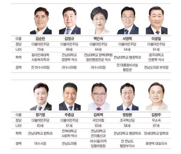 전남도의회에서 잔뼈가 굵은 도의원들의 역공도 만만치 않다. 이광일 전남도의회 제1부의장은 3선 도의원이자 예결위원장, 당 원내대표 등을 두루 역임한 '정책통'임을 내세우며 "여수의 대전환과 더불어 해양관광, 미래 경쟁 산업 고도화를 이끌어 더 크고 탄탄한 여수를 만들겠다"고 약속했다.