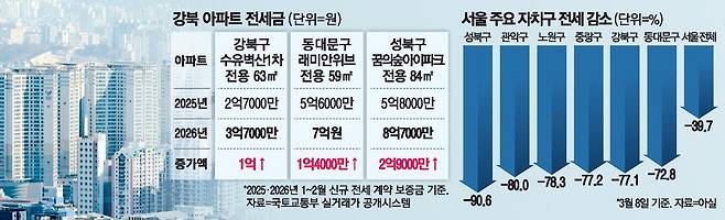 강북구 수유동 수유벽산1차 전용 63㎡는 지난달 3억7000만원에 신규 전세 계약을 맺었는데 1년 새 1억원 오른 금액이다. 동대문구 답십리동 래미안위브 전용 59㎡ 전세는 작년 1월 5억6000만원에 계약됐지만 올해 1월 6억2000만원, 지난달 7억원에 각각 전세 계약서를 썼다. 지난 1년 강남3구(강남·서초·송파) 평균 보증금 증가액(1억1660만원)에 버금간다.