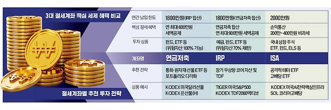 연금저축, 개인형퇴직연금(IRP), 개인종합자산관리계좌(ISA) 등 3대 절세계좌의 특성에 맞게 자금을 쪼개 넣는 전략이 필수다.