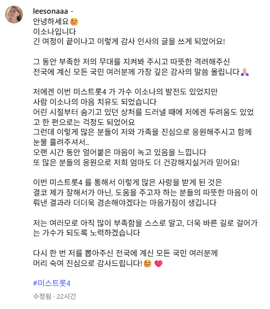 이소나는 지난 7일 자신의 SNS에 "긴 여정이 끝이 나고 이렇게 감사 인사의 글을 쓰게 됐다"며 "그동안 부족한 저의 무대를 지켜봐 주시고 따뜻한 격려를 해주신 전국에 계신 모든 국민 여러분께 가장 깊은 감사의 말씀 올린다"라고 인사를 전했다.