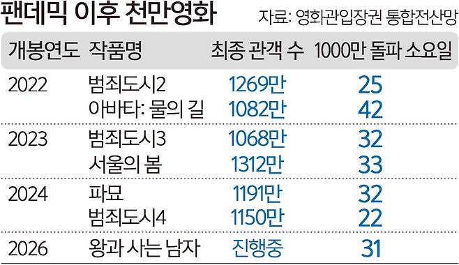 ‘왕사남’은 2024년 4월 개봉한 ‘범죄도시4’ 이후 약 1년 10개월 만에 나온 천만 영화다. 국내 개봉작 기준 역대 34번째, 한국 영화로는 25번째 천만 기록이다. 2022년 이후 3년간 매년 두 편씩 배출됐던 천만 영화는 지난해 그 명맥이 끊겼었다. 코로나19와 OTT가 바꾼 영화 관람 행태 때문에 더는 천만 영화가 나오기 힘을 거라는 우려도 나왔다. ‘왕사남’이 천만을 넘길 것이라고 예상한 사람도 많지 않았다.